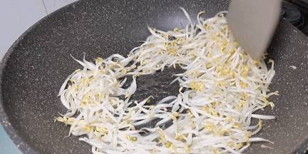 6.用鍋內底油下入綠豆芽,先煸炒1分鐘,把綠豆芽炒軟後加入3克生抽、1克老抽,加入老抽顏色會深一些,要是不喜歡可以不放。