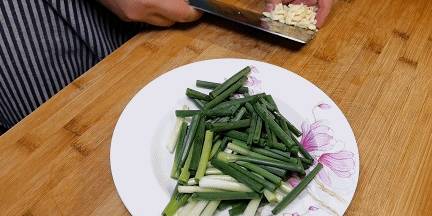 4.小蔥一小把切長段,準備幾粒大蒜切蒜末,把這兩樣輔料放一起備用。
