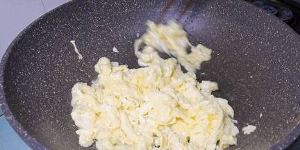 5.炒鍋燒熱淋入植物油,油熱淋入雞蛋液,把雞蛋劃開炒散,炒成雞蛋花盛出。