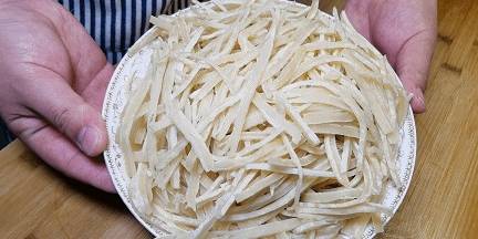 1.首先準備一些餅絲,菜市場一般都有銷售,也可以烙一些大餅切細絲做成餅絲。