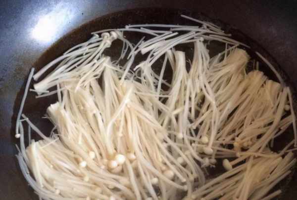 第三步,將金針菇先撕開,用清水沖洗幹凈,在鍋中添上水,將水燒開,放入幾滴食用油,先將金針菇放入鍋中焯水,差不多2分鐘,將金針菇撈出;