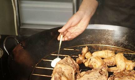 ▲炸雞架。相較於烤雞架的普適性,偏甜的炸雞架更受年輕人的追捧。經過多重調料的醃制,自帶香味的生雞架,直接在油鍋中“歷劫重生”。隨著熱油的沸騰,雞架的調料香,逐漸將周圍的空氣占領。