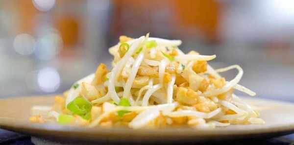 4、豆芽炒熟時加入蔥花、芋頭拌勻後,在鍋邊淋入香醋翻炒出鍋裝盤