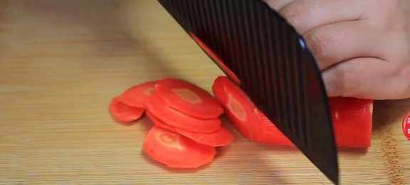第三步,接著準備半根胡蘿蔔去皮然後切成薄片,海鮮菇洗淨切成兩段備用。