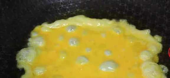 第五步,鍋裏倒入稍微多一點油,油熱後倒入雞蛋液,不用翻炒,把它煎到底部定型,然後翻面煎到兩面焦黃就可以出鍋了,然後將雞蛋餅切成小塊備用。