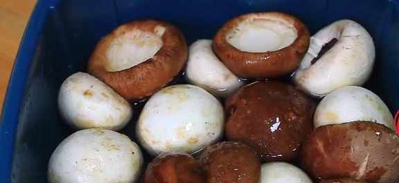第二步,處理好的蘑菇倒入適量清水,加入一勺精鹽,這樣清洗的更加乾淨一些。