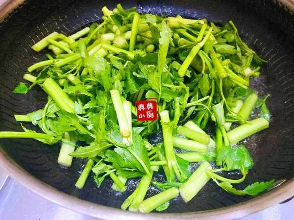起油鍋,把水芹菜放進去翻炒,其實這兩種食材完全可以一起下鍋炒的,都是易熟的食材。