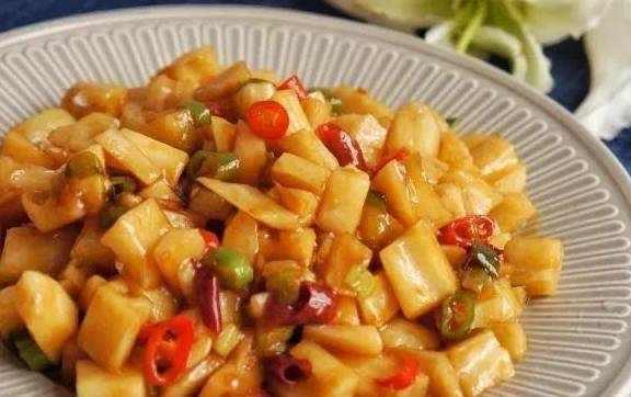 3、倒入控幹水的藕丁,繼續翻炒5分鐘。中間加醋。出鍋前加少許鹽即可。