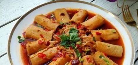 食材:豆皮3張、金針菇250克、香菜1棵、小米辣1個,油2湯匙、花椒適量、大蒜2瓣、蠔油1湯匙、郫縣豆瓣醬1湯匙、生抽醬油1湯匙、雞精1茶匙、白糖1茶匙