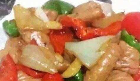 4.將調味汁倒入,汁沸,下雞片翻炒均勻;裝盤;