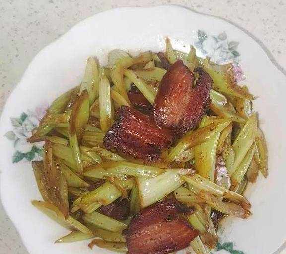 1、香芹去根,摘下葉子更存;胡蘿卜切細條,和芹菜一般粗細;臘肉切片;蒜切片.