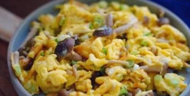 4、平底鍋裡倒入適量的食用油,鍋燒熱之後,把蟹味菇蛋液倒進鍋裡。等邊緣蛋液都蓬起來,就用鍋鏟在鍋裡轉圈攪。把炒蛋攪散成小塊就可以關火瞭。蔥香濃鬱,蘑菇爽滑,雞蛋松軟的蟹味菇滑蛋就做好啦。