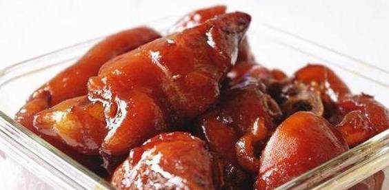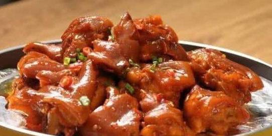 2.油鍋置火上,入紅椒、花椒爆香後,放入豬蹄翻炒一會,加鹽、醬油、紅油、料酒調味。加適量清水燜至熟,待湯汁變濃,盛盤即可。