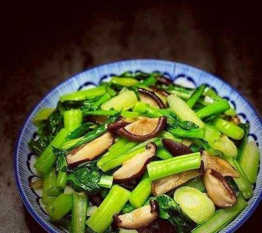 4.青菜翻炒均勻後放入香菇,放入鹽。炒至青菜和香菇變軟即可。