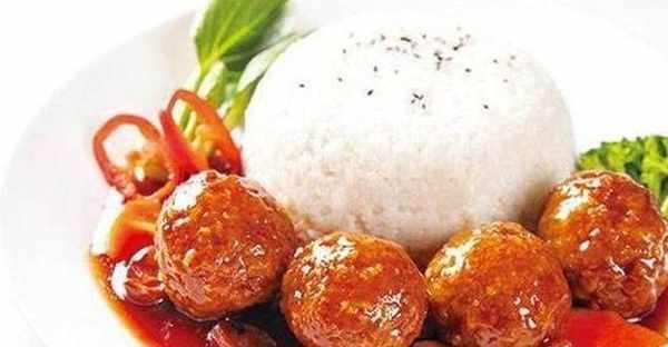 材料:肉丸子、蘿卜丁、豌豆、筍絲、玉米粒、番茄醬、隔夜白飯