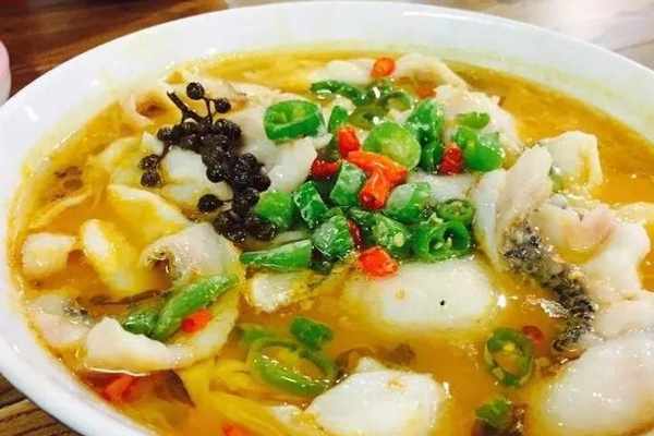 10.魚片一變白,立即關火,一起倒入剛才盛魚骨酸菜的容器裡,另起一鍋,兩到三勺油小火,涼油放入幹辣椒和花椒,辣椒變得紅亮出香氣,把辣椒和花椒撈出放到魚片上,蔥花撒上,大火燒鍋裡的油,冒煙,關火,澆到花椒辣椒蔥花上即可