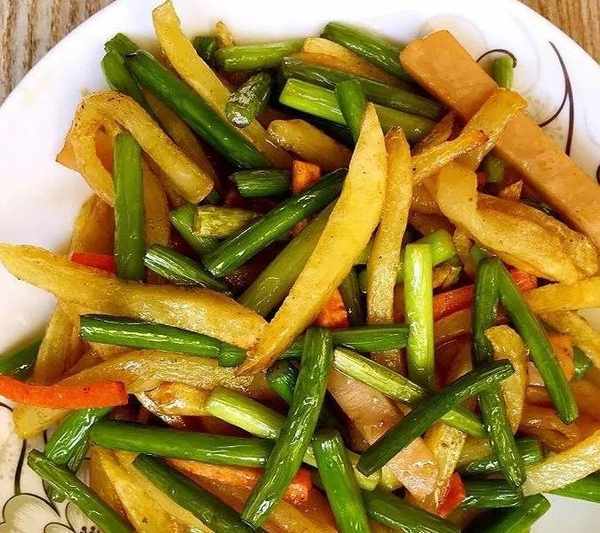 做法:1.蒜苔去頭去尾洗凈。土豆去皮洗凈,切成小手指粗細的條,蒜苔切小段。