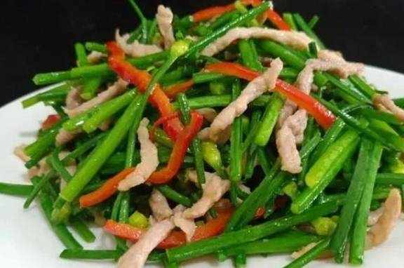 材料:韭菜苔200克、裡脊150克、冬筍1隻、鹽3克、蠔油1大勺、白糖1茶匙、雞精少許;