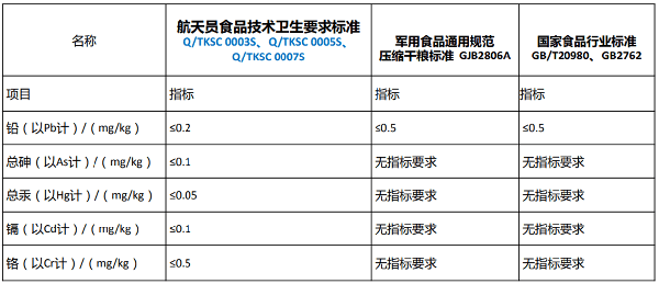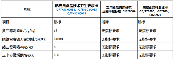 鉛等污染物以及真菌毒素,航天員食品也同樣有著明顯的要求。而軍用食品和我們大眾平時吃到的、采用地方標準生產的食物,都無指標要求。