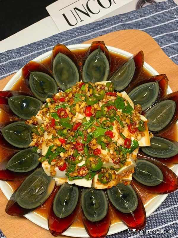 2.皮蛋切好擺盤,放上嫩豆腐,澆上料汁即可