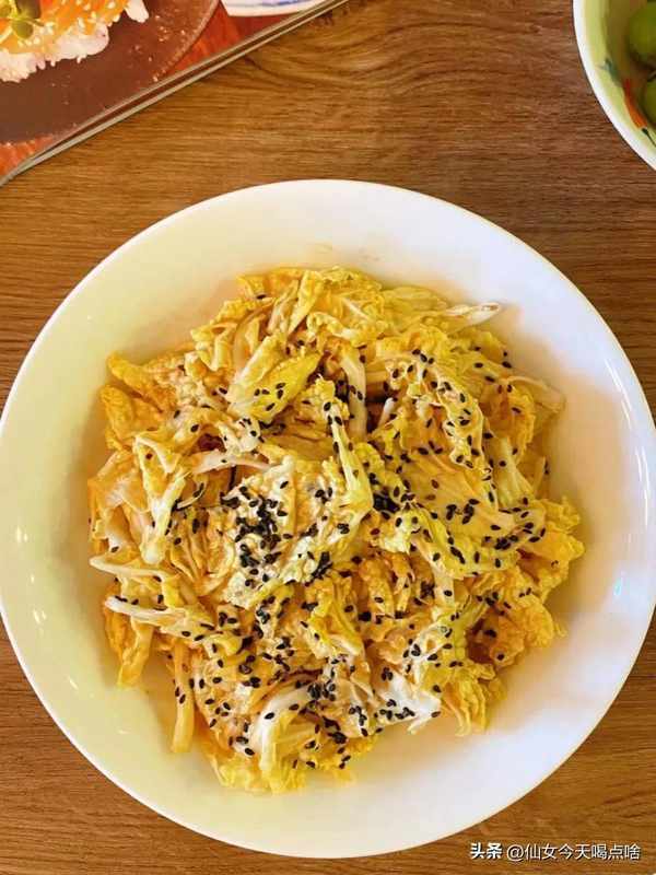 3.最後把撕好的白菜葉拌在芝麻醬裡,抓拌均勻,撒上黑芝麻。