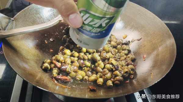 ④此時倒入處理幹凈的田螺,大火猛炒30秒,炒勻後加入足量的啤酒,啤酒跟田螺持平,然後根據個人口味調入適量食鹽,白糖,老抽,13香,胡椒粉,燒開以後,小火燉十分鐘。待到湯汁粘稠後,放少許的味精,雞精,淋入一點香油,撒上一把小蔥花,拌勻即可,裝盤食用。