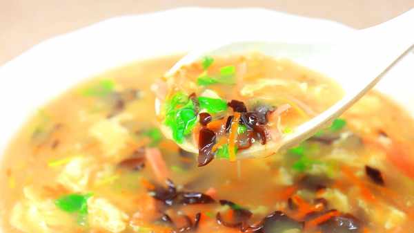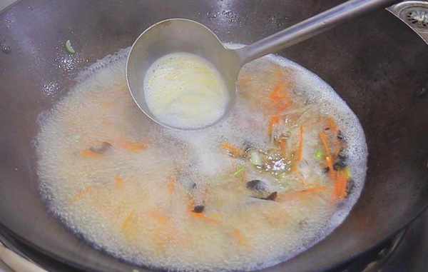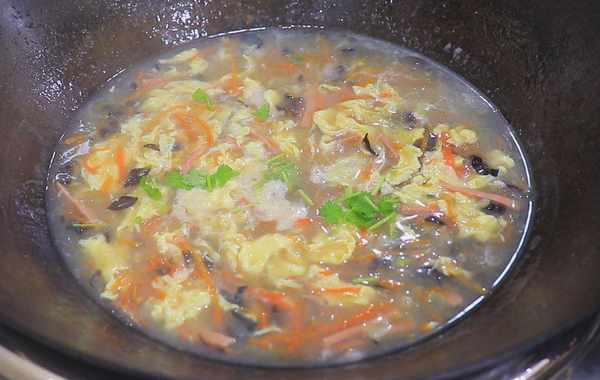 5、邊攪拌邊倒入面糊,調成自己喜歡的濃稠度就可以瞭,繼續煮至湯汁沸騰,然後轉為小火,淋入蛋液,蛋花全部飄起來以後,淋入一點芝麻香油,撒上香菜,美味即成。