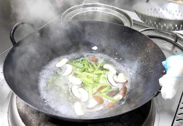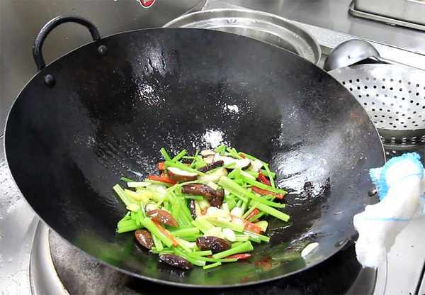 3、鍋內燒油,放入蔥薑蒜翻炒,翻炒出香味以後放入芹菜、香菇和紅椒絲一起翻炒,放入食鹽2克,雞粉2克,料酒5克,加入少許的清水,便於更好地化開調料。