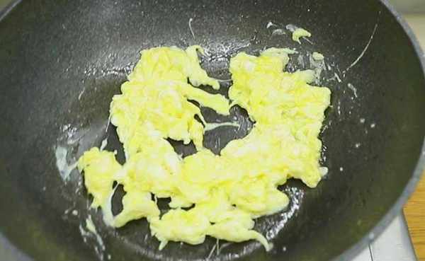 3、鍋內燒油,涼油倒入蛋液,用筷子輕輕的攪散,這樣炒出來的雞蛋又碎又美,蛋液全部凝固以後差不多就熟瞭,倒出來備用。