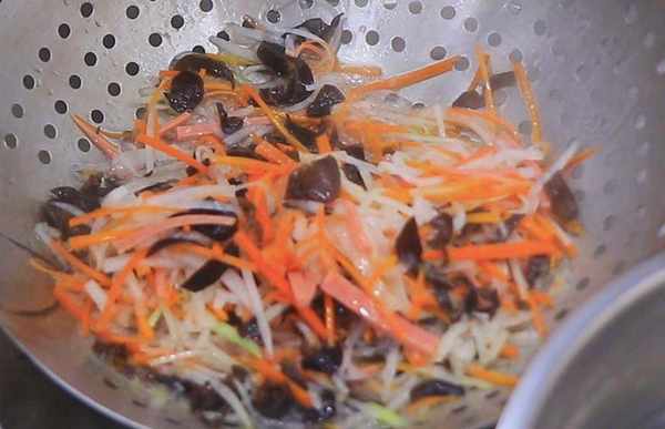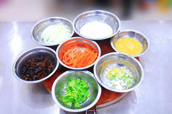 1、把木耳放入清水中浸泡1個小時,泡軟以後撈出來切碎,冬瓜一塊,去除瓜皮和瓜瓤,切成細絲,胡蘿卜半根也切成細絲,再準備一根火腿,切成同樣的細絲,另外切一點蔥花和薑末備用。