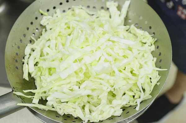 1、準備半個包菜,剔除裡面的硬根和硬桿,以免影響口感,然後把包菜切成絲,不要太細,不然炒的時候容易塌架,賣相不好。把切好的包菜絲放入清水中淘洗幹凈,瀝水備用。