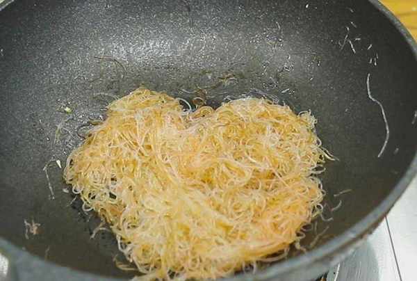 4、不用洗鍋,直接倒入粉絲,開小火幹煸,煸幹以後沿鍋邊淋入少許植物油繼續翻炒均勻。這樣粉絲不斷裂、不粘連、爽滑還筋道,再淋入一點老抽把顏色炒均勻,粉絲充分炒散炒軟以後倒出來備用。