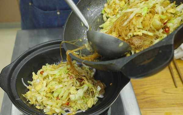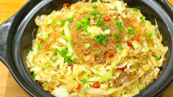 6、包菜想要清脆可口必須全程大火爆炒,盡量不讓它出汁,然後倒入粉絲、雞蛋快速翻炒均勻,讓粉絲吸收料汁入味,淋入一點老抽把顏色調的紅潤一些,大火翻勻即可出鍋。
