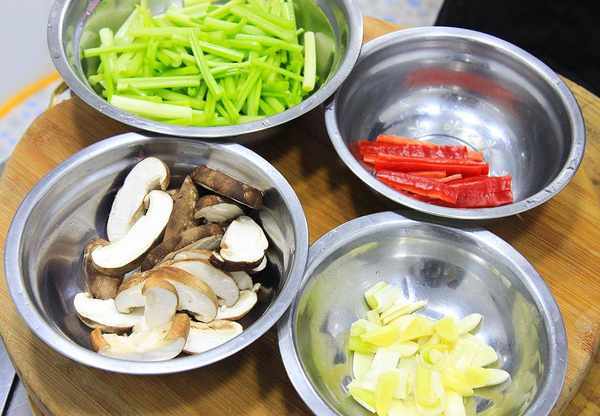 1、準備香菇四個,清洗幹凈以後切成香菇片。芹菜一把,清洗幹凈以後切成芹菜段。大蒜切成蒜片,大蔥破開切成蔥粒,生薑切成薑片,紅椒一片切成紅椒絲。
