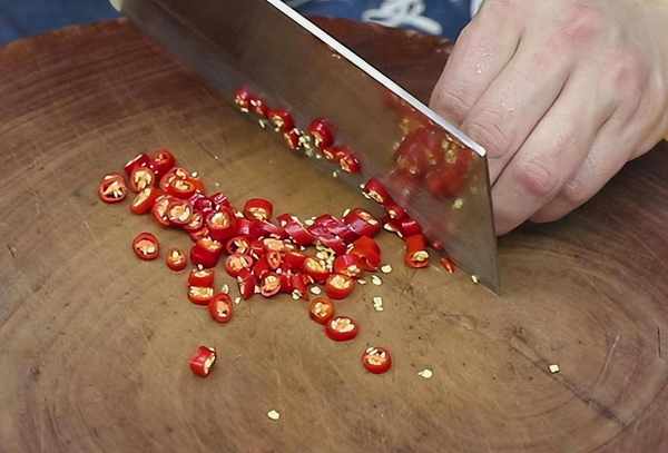 5、鍋內再燒油,放入蒜末、小米椒一起爆香,倒入包菜大火爆炒30秒鐘,包菜斷生以後加入食鹽、味精,少許白糖提鮮,十三香,生抽,繼續大火把調料炒均勻。