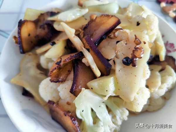 1.將花菜掰成小朵。最好用散菜花,但這次我用的是普通菜花,長得比較緊湊。臘肉切成薄片。切薑片蒜粒備用。