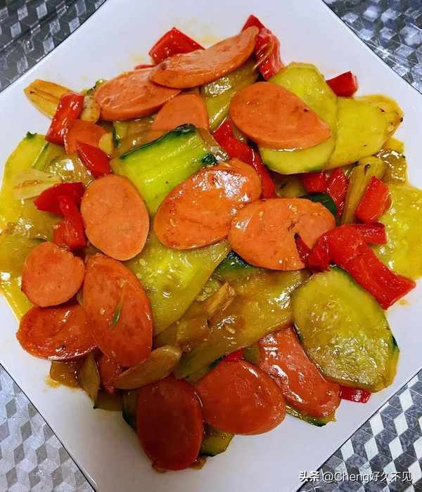 材料:黃瓜、火腿腸、蔥薑蒜、鹽、雞精、料酒、生抽、糖、水淀粉、油