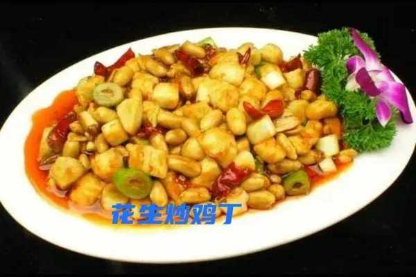 制法:取1份幹淀粉加2份水調勻,部分蔥切片,柿子椒切末,花生仁砸碎。濕淀粉與白糖、醋、醬油、蔥花等調成芡汁。雞肉切小方丁,用鹽、蛋清及幹淀粉拌勻,入熱油鍋中過油,撈出濾油。熱油鍋,先煸柿子椒,再放雞丁略炒,倒入芡汁,急火炒幾下,汁熟,放花生仁,急炒幾下即可。