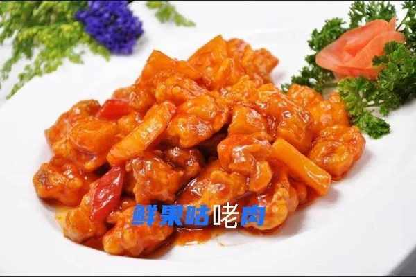 1、五花肉洗凈,切成小塊,用精鹽和料酒抓勻醃漬入味;水果去皮或核,切成小塊,用鹽水浸泡;雞蛋打散,加入五花肉和淀粉攪勻。