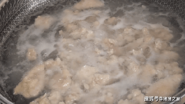 5.鍋中燒水,水開後轉小火,然後一片一片的把肉片放入鍋中,肉片下鍋後千萬不要去動,防止脫粉。肉片全部下完後,用勺子把上面的浮沫打掉,大約1分鐘後再用勺子輕輕推散,肉片煮到全部都飄起來就證明熟瞭。用漏勺撈出來後放入提前準備好的涼白開裡面過一下涼,這樣防止肉片粘連在一起。