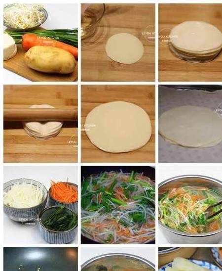 第八步:鍋中倒入適量的水燒開,然後將胡蘿卜絲、土豆絲、豆芽放入鍋中焯1分鐘,再將韭菜放入鍋中焯1分鐘。(蔬菜焯水的時候,可以往鍋裡倒一點油,這樣焯出來的蔬菜顏色更漂亮。)