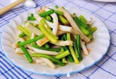 材料:蒜薹200克、魷魚1條。鹽、香油、料酒適量、味精、芥末油少許。