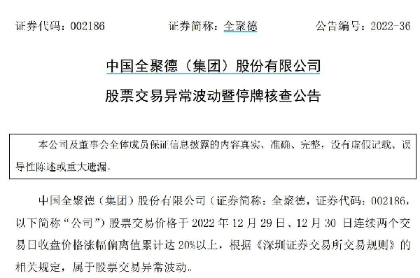 2023年1月2日晚間,全聚德發佈公告稱,由於公司近期股價波動較大,經申請,公司股票自1月3日開市起停牌,就股票交易異常波動情況進行核查,自披露核查公告後復牌。