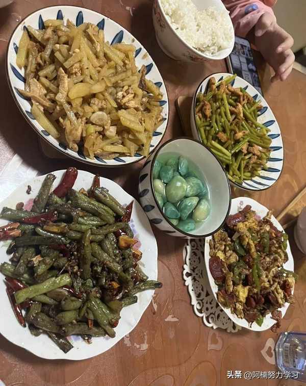 下面這一位的夥食真的平民幸福挺高的瞭,很多炒菜,而且每個看的都非常有食欲啦,雞蛋肉豆角,葷素搭配,幹活不累!非常能顯北方人的飯量!