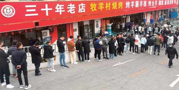 下午不到五點,淄博牧羊村燒烤店內已坐得滿滿當當,服務員來回穿梭忙碌。店門外的隊已排瞭幾十米長。排隊的大學生們手裡拿著菜單提前點菜,有的手裡還拎著一兜零食。牧羊村燒烤店負責人楊本新說:“現在排隊要等接近兩個小時。”