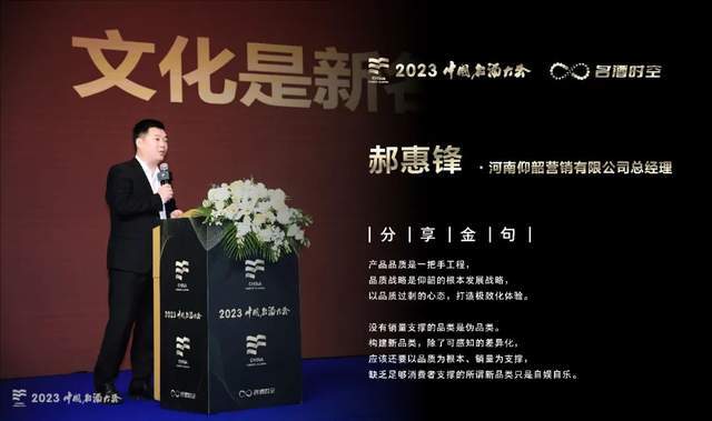 河南仰韶營銷有限公司總經理郝惠鋒出席本次大會,並圍繞《品質為基,文化為魂:仰韶新名酒引領豫酒振興》進行主旨演講,從品質、文化、品類、營銷四大方面解讀仰韶保持增長的原因。現將演講內容進行整理,以饗讀者。