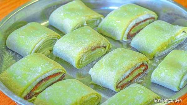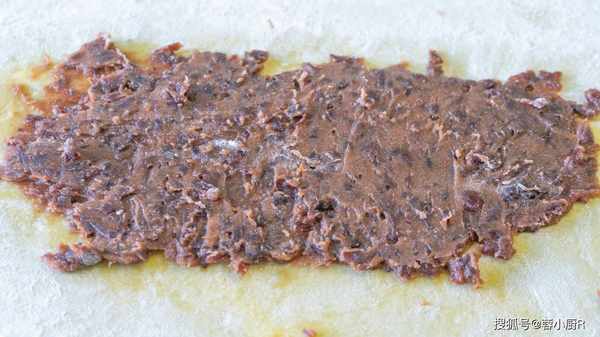 5、抹勻後開始搟面,搟開、搟薄,搟成一張大面片就行瞭。搟面的時候不用太用力,輕輕地搟幾下就搟開瞭,太用力的話容易搟破,也不用搟太薄,表面再抹上一層豆沙餡兒。