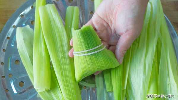 1、玉米三根,先掰掉葉子。然後用剪刀把葉子稍微處理下,頭和尾都剪掉一些。然後起鍋燒水,加一勺鹽,水開放入玉米葉子燙一下,燙軟後立馬撈出來,過一下涼水後瀝幹水分備用。