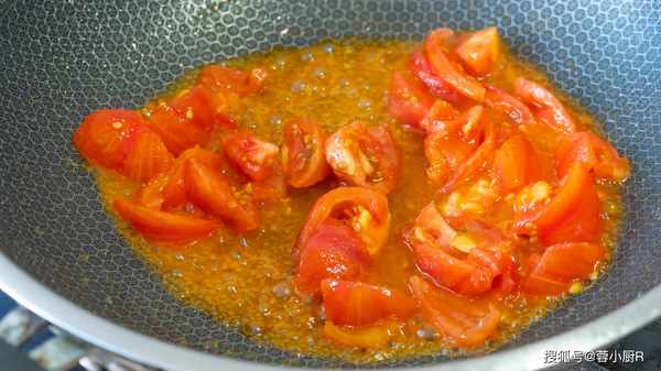 8、撈出來後再過一下涼開水降溫,口感上吃起來會更爽滑勁道,泡一分鐘後撈出來瀝幹水分,裝入盤子後就可以瞭。接著起鍋熱油,倒入西紅柿,加一勺鹽先把西紅柿炒出汁。
