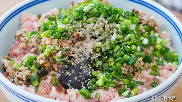 3、接著把泡好的香菇擠一擠水分,也用料理機打成小顆粒,打好後和肉餡裝到一起,再來上一把小蔥花;開始調味兒,鹽、白糖、生抽、蠔油、料酒、雞精、胡椒粉,再來2個蛋清和一大勺蔥油;